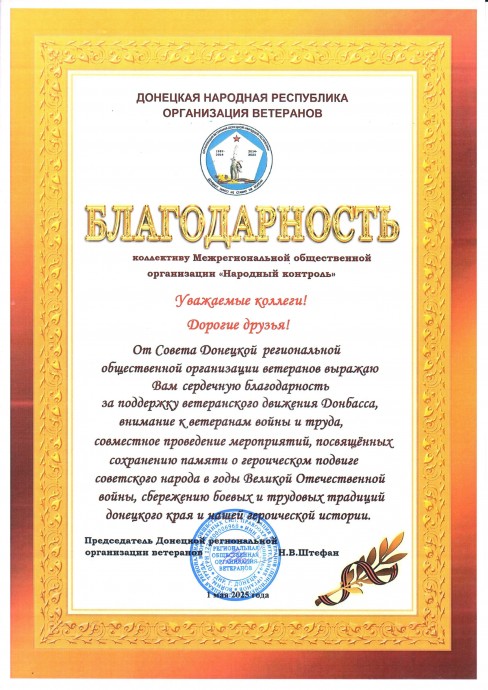 Совет Донецкой региональной общественной организации ветеранов высоко оценил вклад волонтёров в поддержку фронтовиков и тружеников тыла. В рамках торжественной церемонии представителям «Народного контроля» были вручены памятные медали, посвящённые 80-летию Великой Победы, как символ признания их усилий в деле сохранения исторической памяти и заботы о старшем поколении.