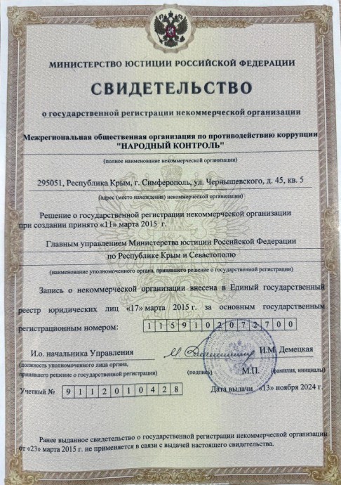 ООО «МРОО НК по противодействию коррупции» создана в марте 2015 года, зарегистрирована в установленном Законом порядке 17.03.2015.